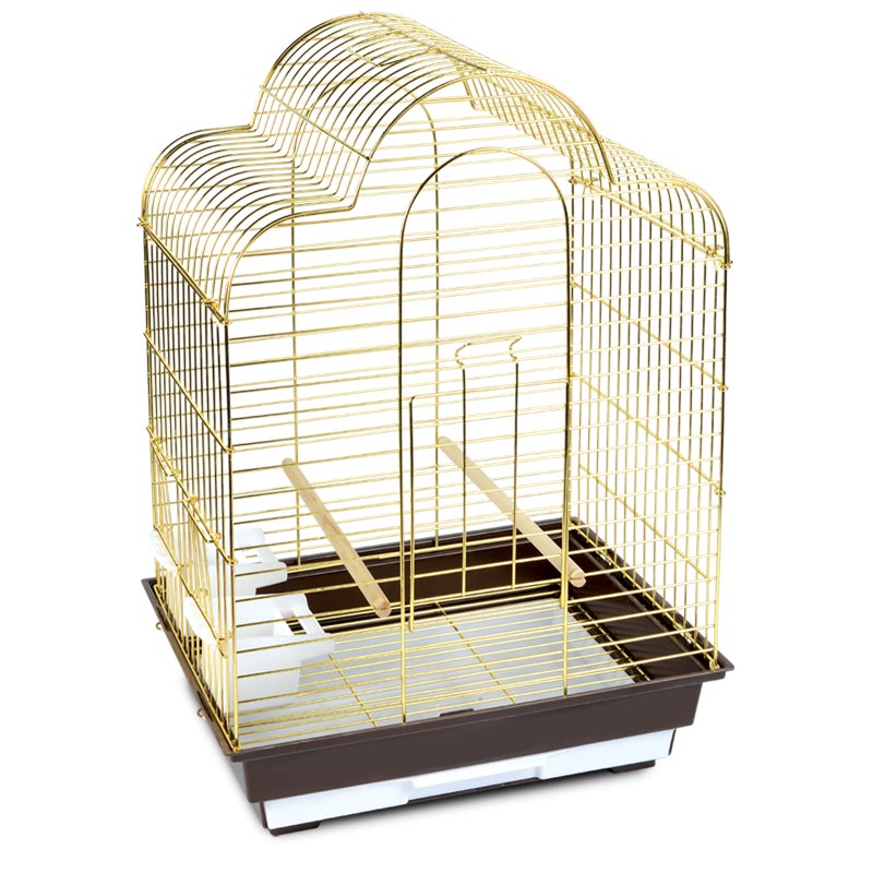 "Золотая" клетка для птиц с полукруглой крышей - полезный аксессуар для владельцев пернатых питомцев. Надежная, просторная и очень удобная, такая клетка займет достойное место в любом интерьере, отвечая всем жизненным потребностям домашних любимцев. В комплектацию изделия входят 2 пластиковые кормушки и 2 деревянные жердочки. Клетка оборудована удобной ручкой для переноски и специальным пластиковым наружным поддоном, облегчающим процесс уборки. Цвет: коричневый. Размер изделия: 520*410*665мм.