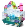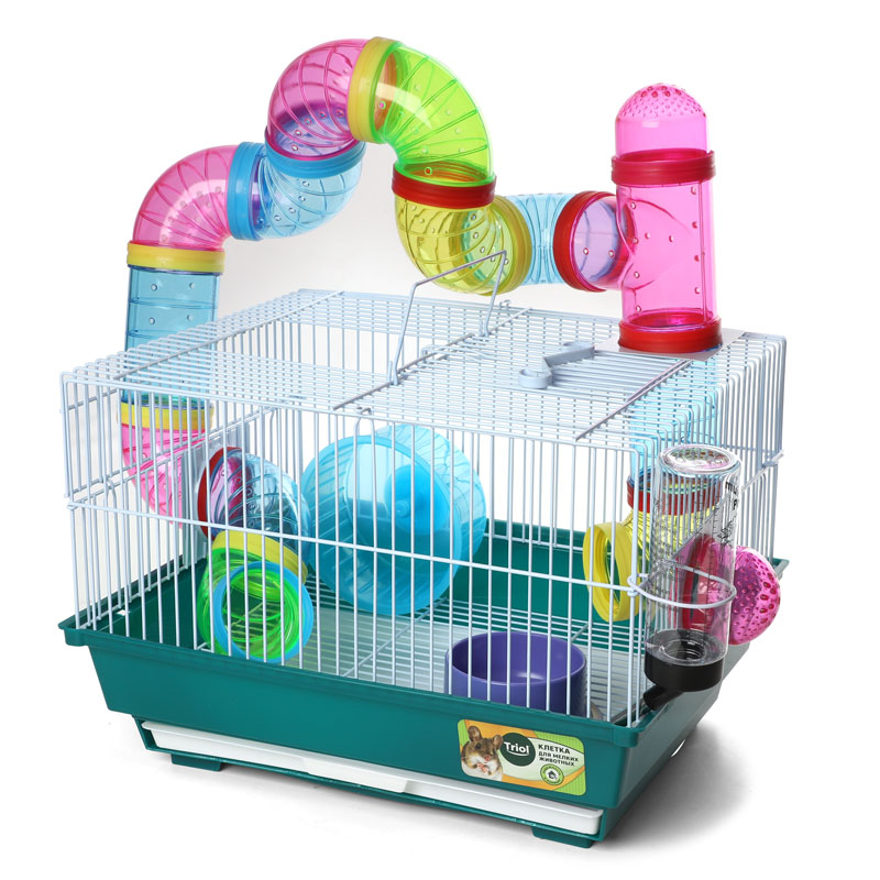 Яркая клетка прямоугольной формы с вертикальными прутьями имеет два этажа и внешние тоннели-переходы. Данная клетка - целый развлекательный комплекс для грызуна, который занимает немного места и отлично подходит для мелких домашних животных вроде крыс, мышей и хомяков. В комплектацию изделия также входят: пластиковая миска, поилка с носиком, уютный домик на втором ярусе и беговое колесо. Кроме того, клетка оборудована специальным пластиковым наружным поддоном, облегчающим процесс уборки. Размер изделия: 395х295х380мм. Цвет: сиреневый, морской волны, голубой.