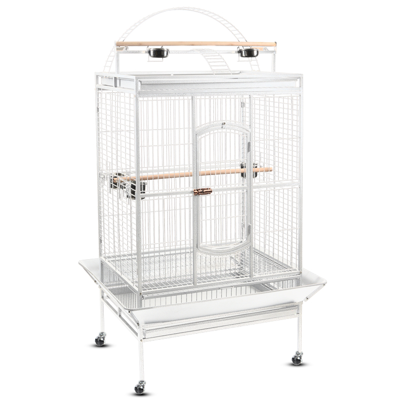 Прочная, эффектная и функциональная стальная клетка на колесах, предназначенная для птиц и попугаев крупных размеров. Ее прутья не гнутся, не облупляются и не гремят. Клетка имеет большую удобную дверцу, надежно запирающуюся на плотный замок, а за счет дополнительной внешней конструкции выгуливать птиц можно прямо на крыше изделия. Такая клетка займет достойное место в любом интерьере, отвечая всем жизненным потребностям пернатых питомцев. Клетка также оборудована специальным выдвижным поддоном, облегчающим процесс уборки. Цвет: белый. Размер изделия: 830х770х1720мм.