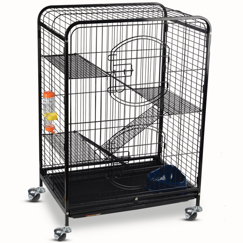 Клетка-вольер для животных (хорьков, белок, шиншилл, крупных дегу, крыс) с выдвижным пластиковым поддоном с высокими бортиками, который максимально упрощает процесс уборки. На фасаде клетки имеются две большие удобные дверцы с надежными запирающими механизмами. Комплектация: 4 полки, 4 лесенки, автопоилка объемом 250 мл и миска. Расстояние между прутьями 2,5 см. Бесшумное и аккуратное передвижение по комнате обеспечивают съемные шарообразные колеса. Цвет: черный металлик. Размер изделия: 790х525х1400мм.