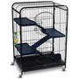 Клетка-вольер для животных (хорьков, белок, шиншилл, крупных дегу, крыс) с выдвижным пластиковым поддоном с высокими бортиками, который максимально упрощает процесс уборки. На фасаде клетки имеются две большие удобные дверцы с надежными запирающими механизмами. Комплектация: 4 полки, 4 лесенки, автопоилка объемом 250 мл и миска. Расстояние между прутьями 2,5 см. Бесшумное и аккуратное передвижение по комнате обеспечивают съемные шарообразные колеса. Цвет: черный металлик. Размер изделия: 790х525х1400мм.