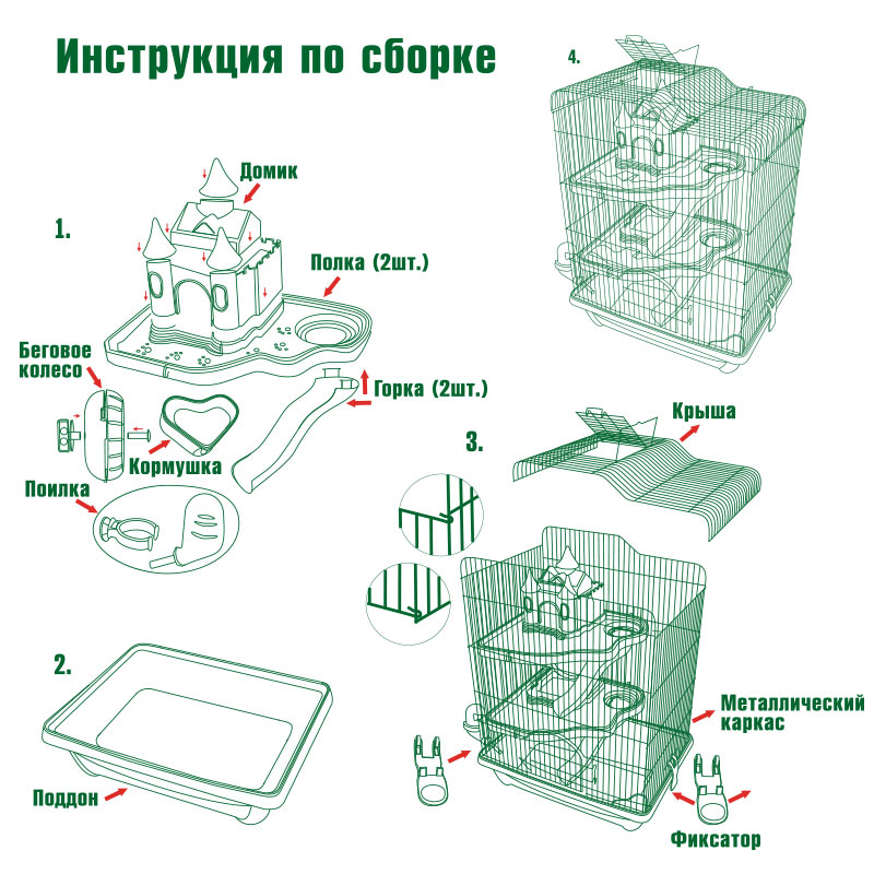 Складная компактная цветная клетка с прочным металлическим каркасом. Она не занимает много места и отлично подходит для мелких домашних животных вроде крыс, мышей и хомяков. В комплектацию изделия также входят: пластиковая миска, поилка с носиком, горка со второго яруса на первый, вместительный домик и беговое колесо. Клетка также оборудована специальным пластиковым наружным поддоном, облегчающим процесс уборки, а удобная ручка сверху максимально упрощает транспортировку изделия. Цвет: белый/зеленый. Размер изделия: 225х170х250мм.