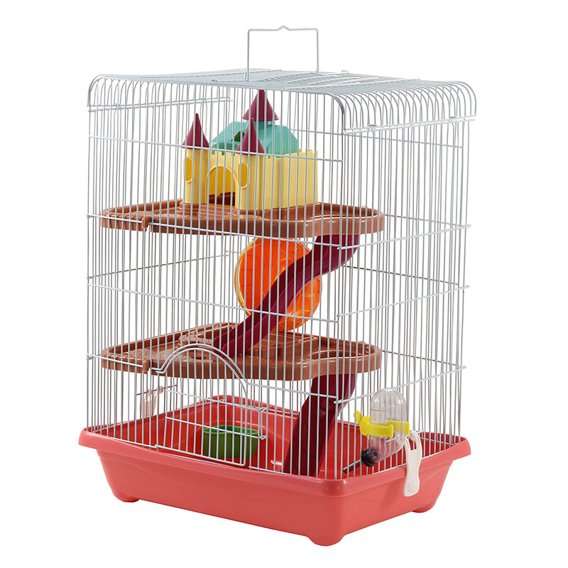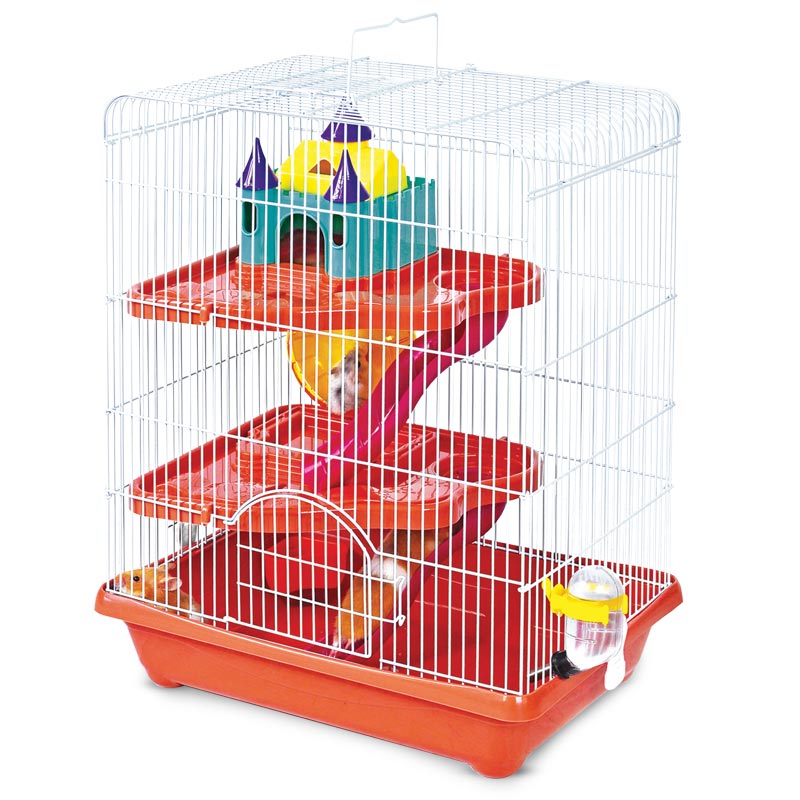 Трехэтажная вертикальная клетка прямоугольной формы с прочным металлическим каркасом. Такая клетка - целый развлекательный комплекс для грызуна, который занимает немного места и отлично подходит для мелких домашних животных вроде крыс, мышей и хомяков. В комплектацию изделия также входят: пластиковая миска, поилка с носиком, уютный домик в виде замка, горка и беговое колесо. Клетка оборудована специальным пластиковым наружным поддоном, облегчающим процесс уборки, а удобная ручка сверху максимально упрощает транспортировку изделия. Цвет: желтый, малиновый, зеленый, синий. Размер изделия: 350х260х460мм.
