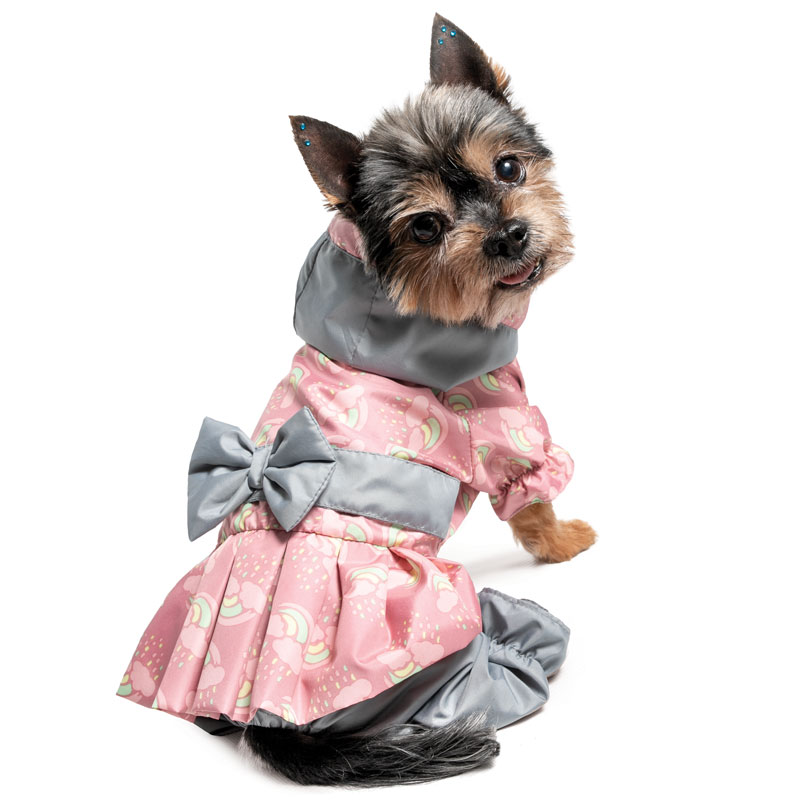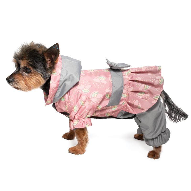 Яркий демисезонный комбинезон с капюшоном и юбочкой изготовлен из курточной ткани Дюспо, которая эффективно отталкивает влагу, не пропускает ветер, не боится сильных морозов и ярких солнечных лучей. Подкладка выполнена из подкладочной ткани, что позволяет препятствовать образованию колтунов. Комбинезон выполнен с учетом анатомических особенностей тела собаки, имеет специальные вставки из резинок, что позволяет изделию плотно сидеть на собаке.