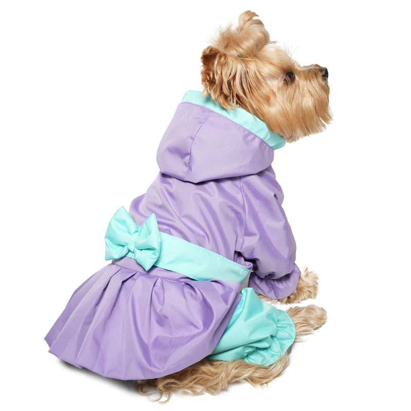 Яркий демисезонный комбинезон с капюшоном и юбочкой изготовлен из курточной ткани Дюспо, которая эффективно отталкивает влагу, не пропускает ветер, не боится сильных морозов и ярких солнечных лучей. Подкладка выполнена из подкладочной ткани, что позволяет препятствовать образованию колтунов. Комбинезон выполнен с учетом анатомических особенностей тела собаки, имеет специальные вставки из резинок, что позволяет изделию плотно сидеть на собаке.