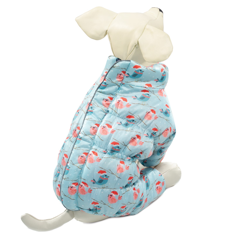 Утепленный комбинезон "Веселые пташки" с молнией на спине - это практичный, стильный и по-настоящему теплый аксессуар для собак. Такая одежда защитит шерсть животного от грязи, а непродуваемая ткань - от сильного ветра и холода. Благодаря продуманному до мелочей крою комбинезон садится "по фигуре" питомца и не стесняет движений во время прогулки за счет эластичной резинки на талии. Изделие с модным принтом и воротником застегивается при помощи молнии на спине, защищенной от попадания шерсти, грязи или налипания снега специальной планкой. Особенностью комбинезона является светоотражающая полоска, идущая по спинке изделия, - для максимальной безопасности животного на дороге. Изделие имеет закрытую зону на животе, а подкладка выполнена из флиса. Модель унисекс. Длина спины: 400мм; обхват груди: 500мм; обхват шеи: 360мм. Цвет: светло-бирюзовый.