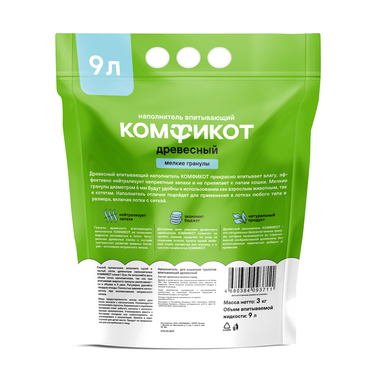 Древесный впитывающий наполнитель КОМФИКОТ прекрасно впитывает влагу, эффективно нейтрализует неприятные запахи и не прилипает к лапам кошки. Мелкие гранулы диаметром 6 мм будут удобны в использовании как взрослым животным, так и котятам. Наполнитель отлично подойдет для применения в лотках любого типа и размера, включая лотки с сеткой. Способ применения: заполните сухой и чистый лоток древесным наполнителем КОМФИКОТ слоем 1-3 см. Не заполняйте весь объем лотка наполнителем, так как при впитывании жидкости гранулы увеличиваются в объеме в 3 раза. Регулярно удаляйте твердые отходы. Полностью замените наполнитель при возникновении неприятного запаха. Состав: древесина хвойных пород. Масса нетто: 3 кг. Объем впитываемой жидкости: 9 л.
