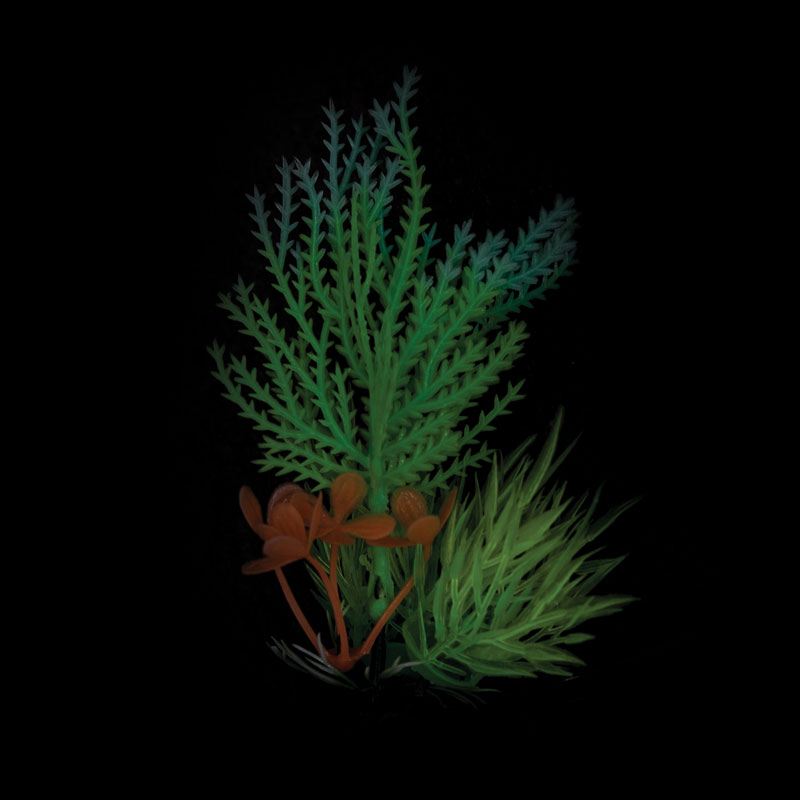 Растения - это не только завершающий штрих в оформлении, но и необходимый атрибут любого аквариума. Они придают трехмерность внутреннему пространству аквариума, а также служат дополнительным укрытием для небольших рыб, отвечая тем самым не только за эстетику, но и принося обитателям аквариума реальную пользу. Неоспоримое преимущество искусственных растений в том, что в них не заводятся паразиты и грибки, их легко мыть и дезинфицировать, и прослужат они неизмеримо дольше, чем живые растения. Изготовленное из нетоксичного пластика, светящееся растение для аквариума с тяжелой керамической подставкой подойдет для оформления любых типов пресноводных аквариумов. В состав пластика входит люминофор, который в течение светового дня накапливает энергию, а в темноте начинает ее отдавать, в результате чего от растений исходит фосфоресцирующее сияние.