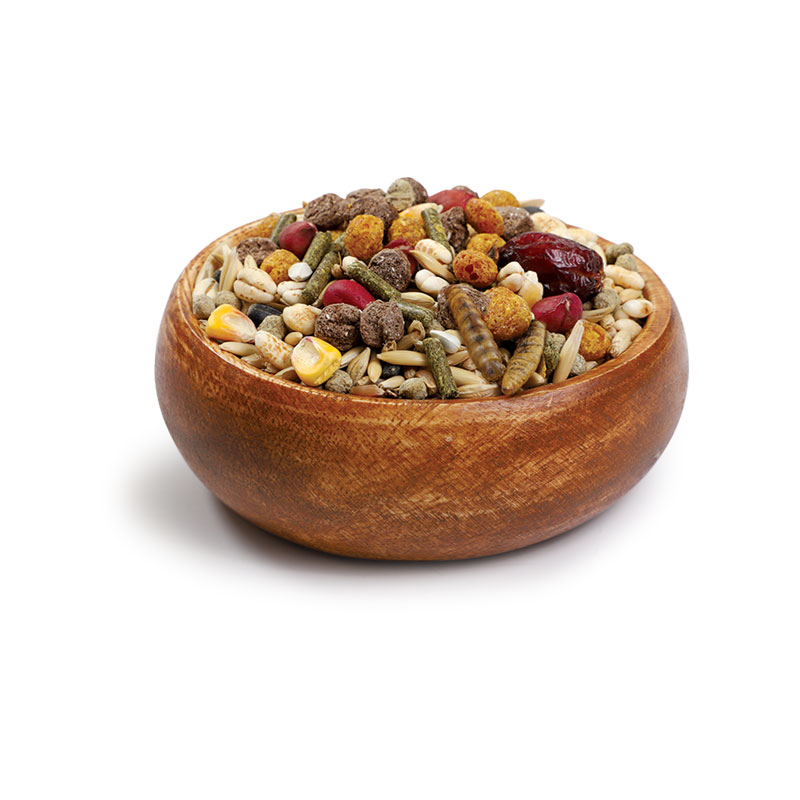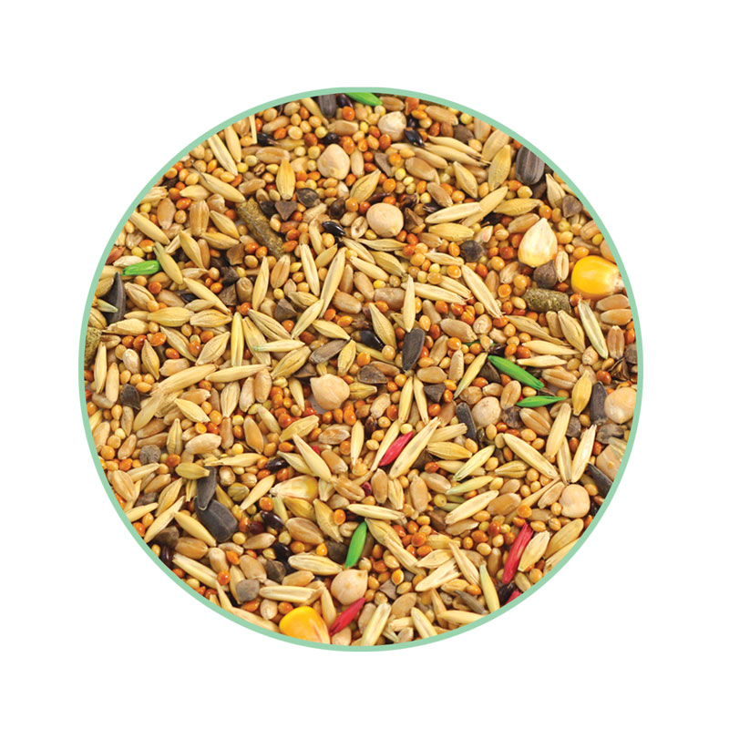 Состав: ячмень, пшеница, овес, просо белое, просо красное, семена подсолнечника, гречка, экструдированные шарики (кукуруза, морковь, мел природный, витамин A, D3, E, K3, B1, B2, B3, B5, B6, B12, H, железо, марганец, цинк, медь, йод, экстракт юкки), гранулы мультизлаковые (сбор луговых трав, пшеница, ячмень, кукуруза, семена льна), сафлор, трава суданская (семена), кукуруза плющеная, семена льна, кэроб, арахис, воздушный ячмень, шиповник, личинка черной львинки.