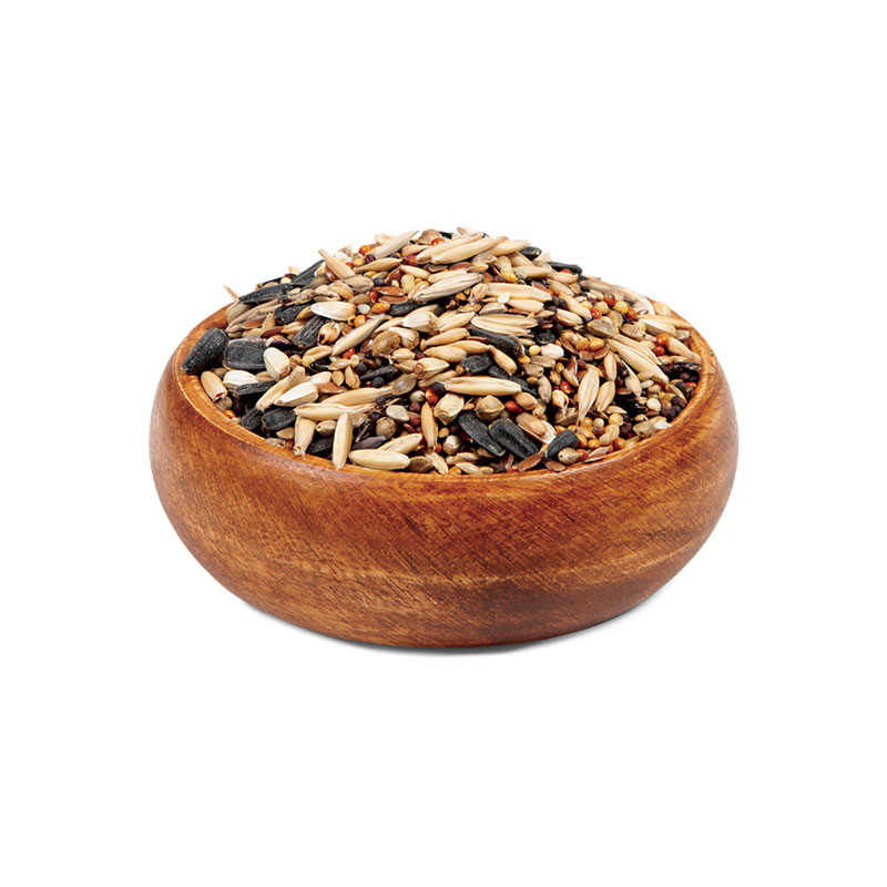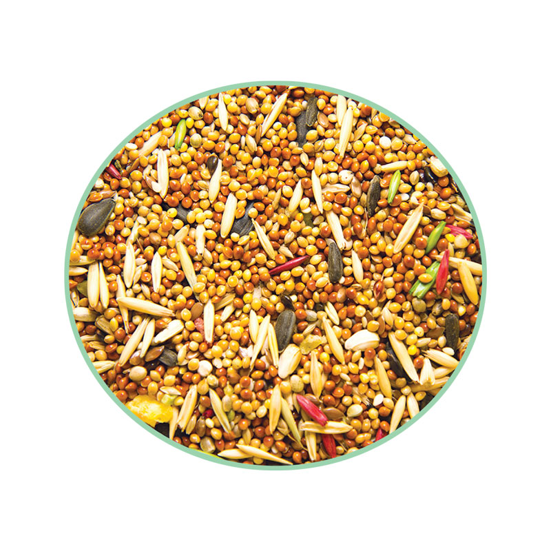 Состав: рапс, просо белое, просо красное, канареечное семя, семена льна, овёс голозерный, овес, пшено, семена подсолнечника, семена конопли, трава суданская (семена), кунжут, сорго, сафлор, клевер луговой, чумиза.