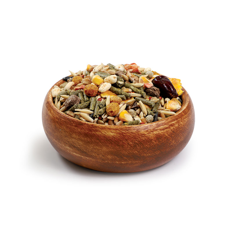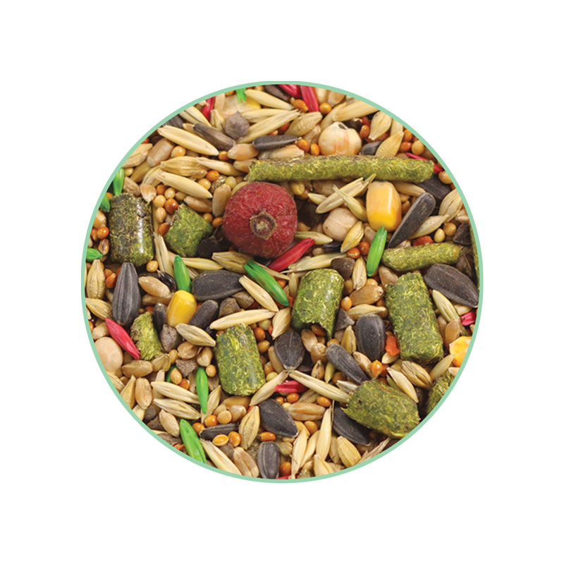 Состав: пшеница, ячмень, овес, семена подсолнечника, гранулы мультизлаковые (сбор луговых трав, пшеница, ячмень, кукуруза, семена льна), просо белое, просо красное, гречка, гранулы травяные, кукуруза плющеная, экструдированные шарики (кукуруза, морковь, мел природный, витамин A, D3, E, K3, B1, B2, B3, B5, B6, B12, H, железо, марганец, цинк, медь, йод, экстракт юкки), воздушный ячмень, кэроб, шиповник, морковь.