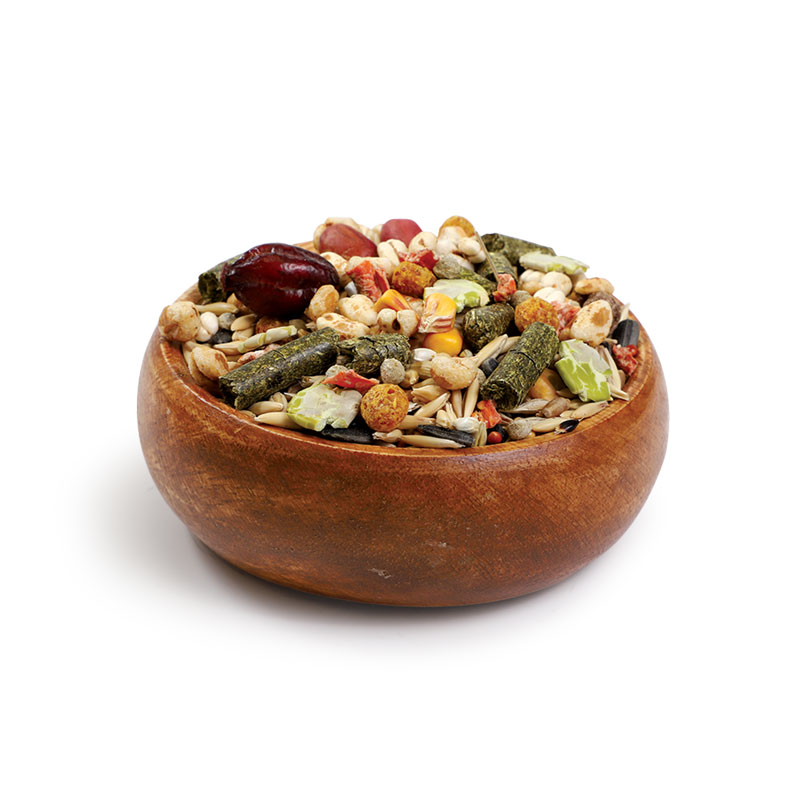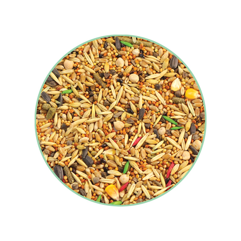 Состав: овес, ячмень, пшеница, семена подсолнечника, просо белое, просо красное, кукуруза плющеная, гранулы травяные, гранулы мультизлаковые (сбор луговых трав, пшеница, ячмень, кукуруза, семена льна) трава суданская (семена), горох плющеный, сафлор, экструдированные шарики (кукуруза, морковь, мел природный, витамин A, D3, E, K3, B1, B2, B3, B5, B6, B12, H, железо, марганец, цинк, медь, йод, экстракт юкки), морковь, арахис, воздушная пшеница, воздушный ячмень.