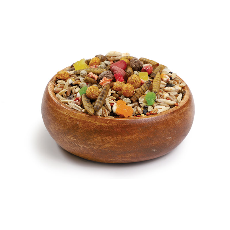 Состав: пшеница, ячмень, овес, просо белое, просо красное, семена подсолнечника, гречка, трава суданская (семена), экструдированные шарики (кукуруза, морковь, мел природный, витамин A, D3, E, K3, B1, B2, B3, B5, B6, B12, H, железо, марганец, цинк, медь, йод, экстракт юкки), сафлор, гранулы мультизлаковые (сбор луговых трав, пшеница, ячмень, кукуруза, семена льна), семена льна, цукаты, арахис, морковь, кэроб, кукуруза плющеная, воздушный ячмень, личинка черной львинки.