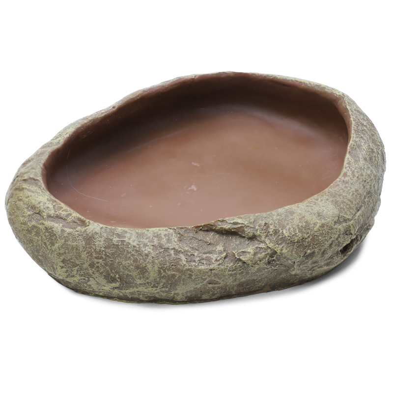 Глубокая и тяжелая кормушка-поилка для рептилий из полиэфирной смолы. Имитация природного камня. Можно использовать в любых террариумах.