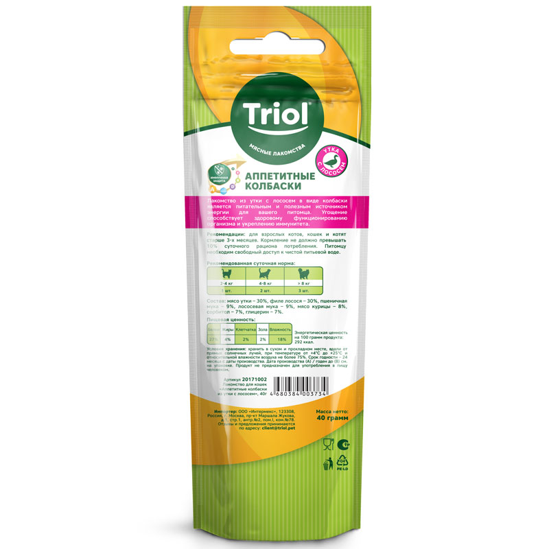 Лакомство для кошек «Аппетитные колбаски из утки с лососем», 40г, Triol
