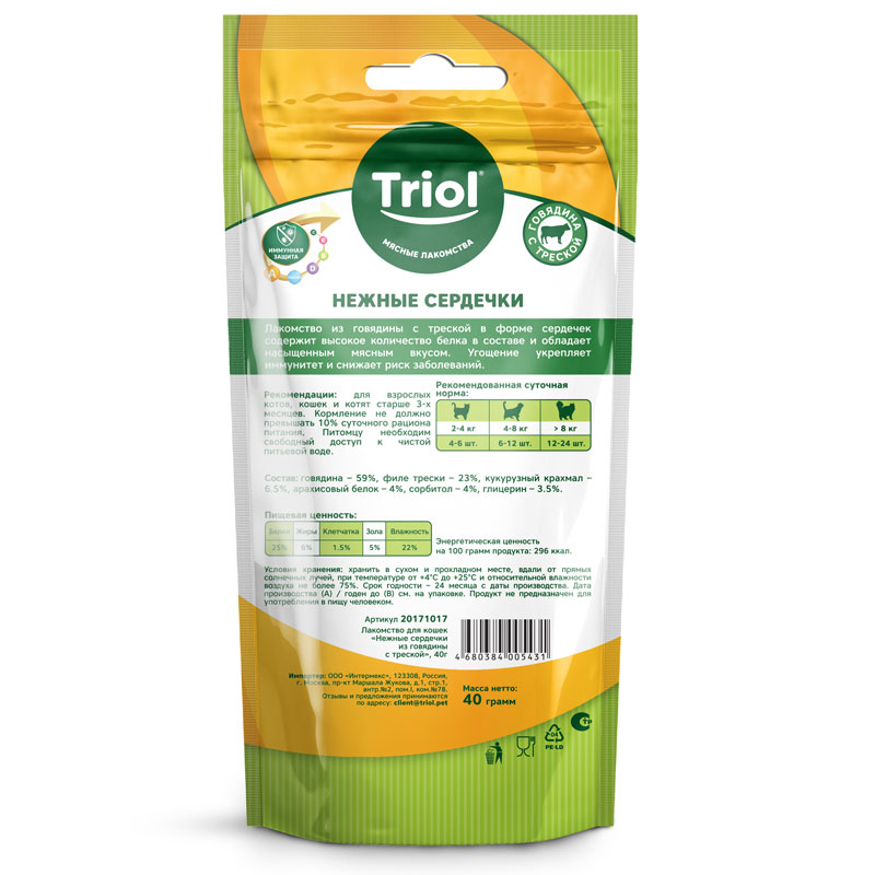 Лакомство для кошек «Нежные сердечки из говядины с треской», 40г, Triol