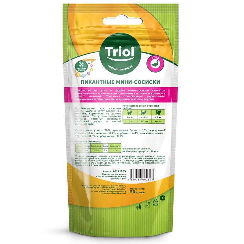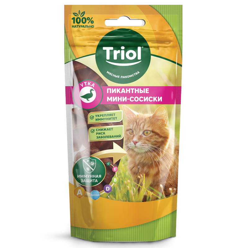 Лакомство для кошек «Пикантные мини-сосиски из утки», 50г, Triol