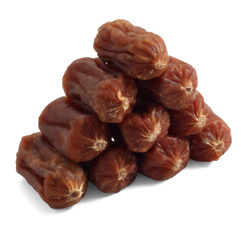 Состав: мясо утки - 70%, арахисовый белок - 10%, кукурузный крахмал - 7%, глицерин - 6.2%, сорбитол - 4.4%, говяжий коллаген - 2%, соль - 0.3%, сорбат калия - 0.1%.