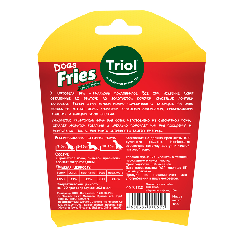 Лакомство для собак FUN FOOD "Картофель фри", 100г, Triol