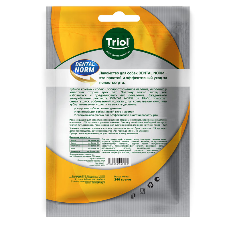 Лакомство для собак DENTAL NORM - это простой и эффективный уход за полостью рта. Зубной камень у собак - распространенное явление, особенно у животных старше трех лет. Поэтому важно знать, как избавиться и предотвратить его появление. Ежедневное употребление лакомств DENTAL NORM от TRIOL помогает снизить риск заболеваний полости рта, качественно очистить зубы, уменьшить налет и освежить дыхание.