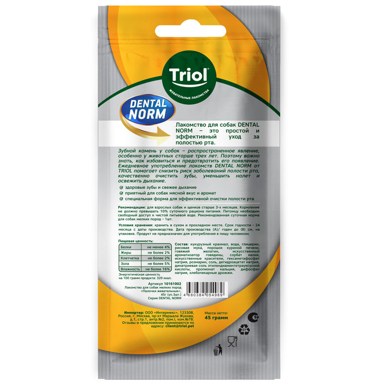 Лакомство для собак DENTAL NORM - это простой и эффективный уход за полостью рта. Зубной камень у собак - распространенное явление, особенно у животных старше трех лет. Поэтому важно знать, как избавиться и предотвратить его появление. Ежедневное употребление лакомств DENTAL NORM от TRIOL помогает снизить риск заболеваний полости рта, качественно очистить зубы, уменьшить налет и освежить дыхание.