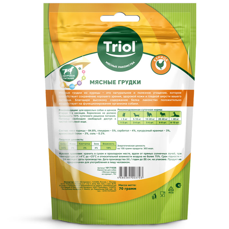 Мясные грудки из курицы – это натуральное и полезное мясное угощение для хорошего зрения, здоровья кожи и шерстного покрова вашего питомца, обогащенное витамином А. Вес нетто 70г.