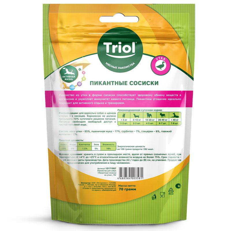 Лакомство для собак «Пикантные сосиски из утки», 70г, Triol