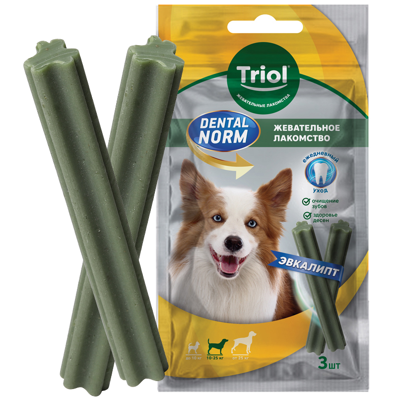 Лакомство для собак DENTAL NORM - это простой и эффективный уход за полостью рта. Зубной камень у собак - распространенное явление, особенно у животных старше трех лет. Поэтому важно знать, как избавиться и предотвратить его появление. Ежедневное употребление лакомств DENTAL NORM от TRIOL помогает снизить риск заболеваний полости рта, качественно очистить зубы, уменьшить налет и освежить дыхание.
