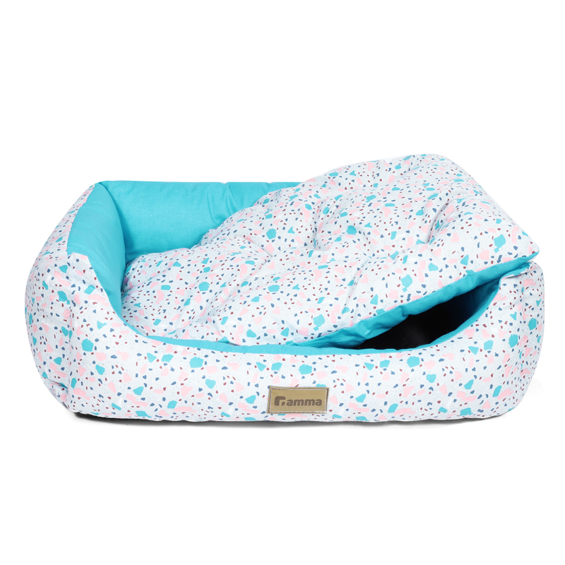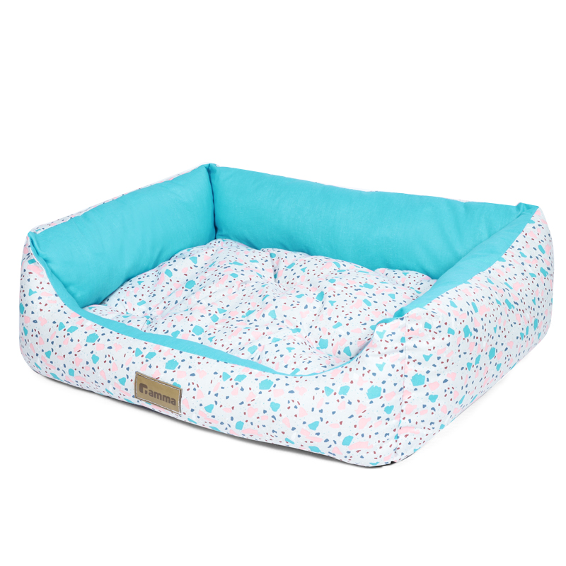 Очень комфортная лежанка c высоким бортом с покрытием под замшу. Наполнитель - синтепон. Мягкая съемная подушка с дизайнерским принтом. Подушка имеет съемный чехол на молнии, удобный в стирке. Дно выполнено из водонепроницаемой ткани. Цвет: синий с голубым. Размер: 750*650*150мм.