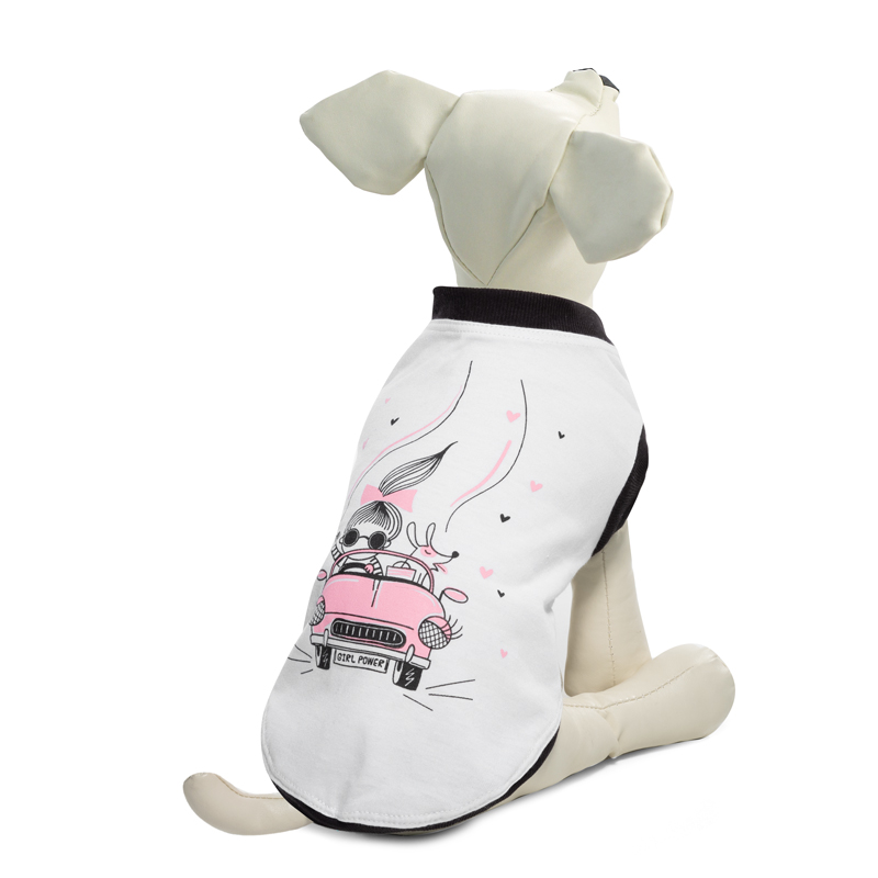 Стильная майка для активной девочки. Майка выполнена из хлопка белого цвета и украшена на спинке очаровательным принтом. Легкая майка свободно ложится на тело, горловина и вырезы для лапок отделаны широким мягким кантом, который обеспечивает комфорт при ходьбе и беге, не цепляет шерсть и не сбивает ее в комки. Удобная и комфортная, эта майка разнообразит гардероб вашей любимицы и станет прекрасным аксессуаром на каждый день. Размеры изделия: 250х380х270мм. Цвет: белый.
