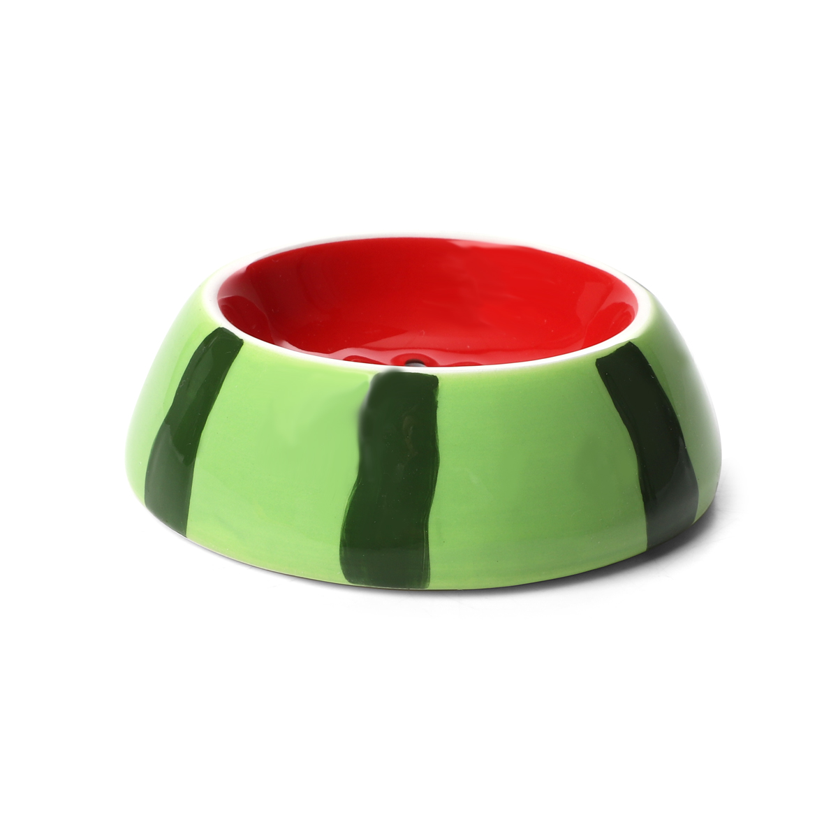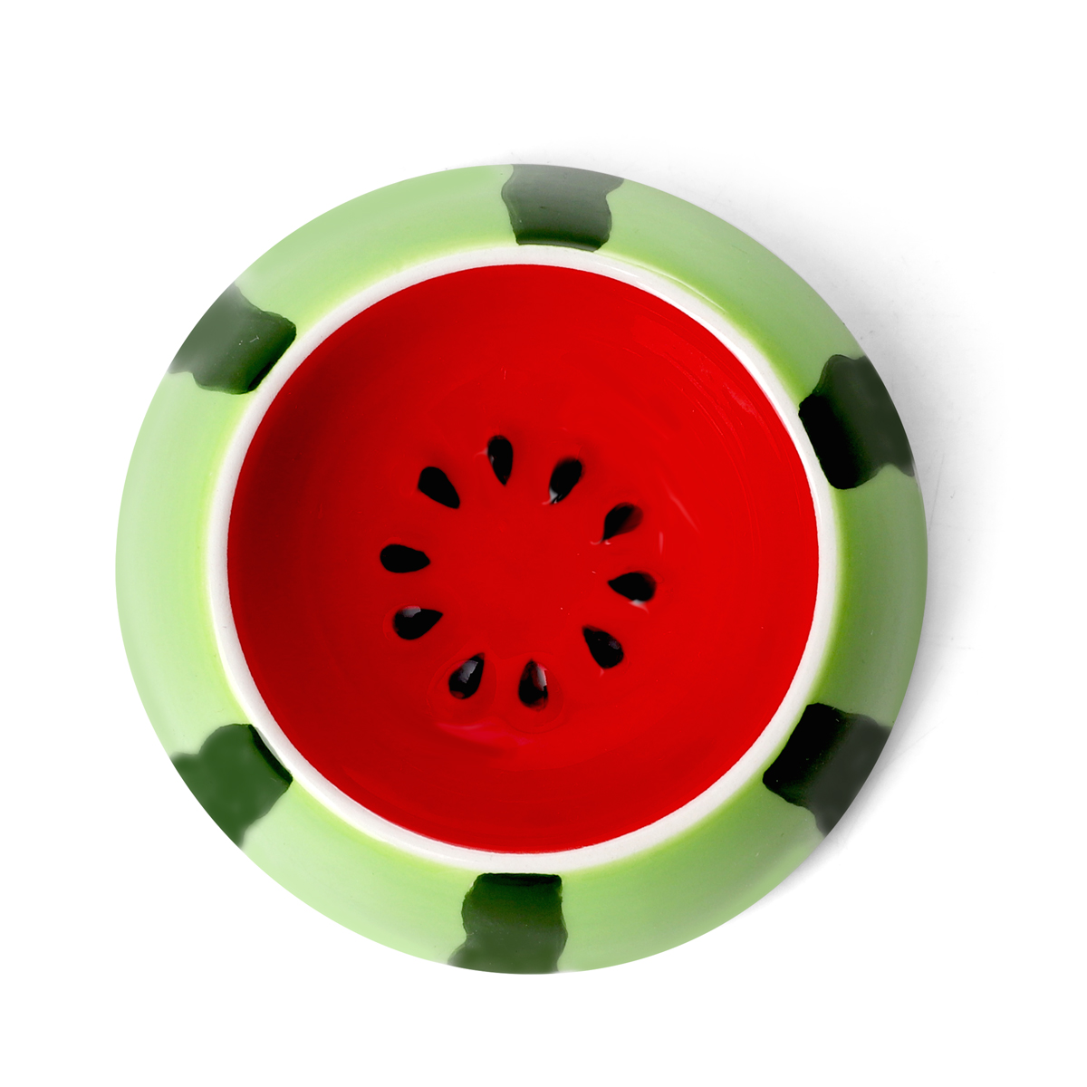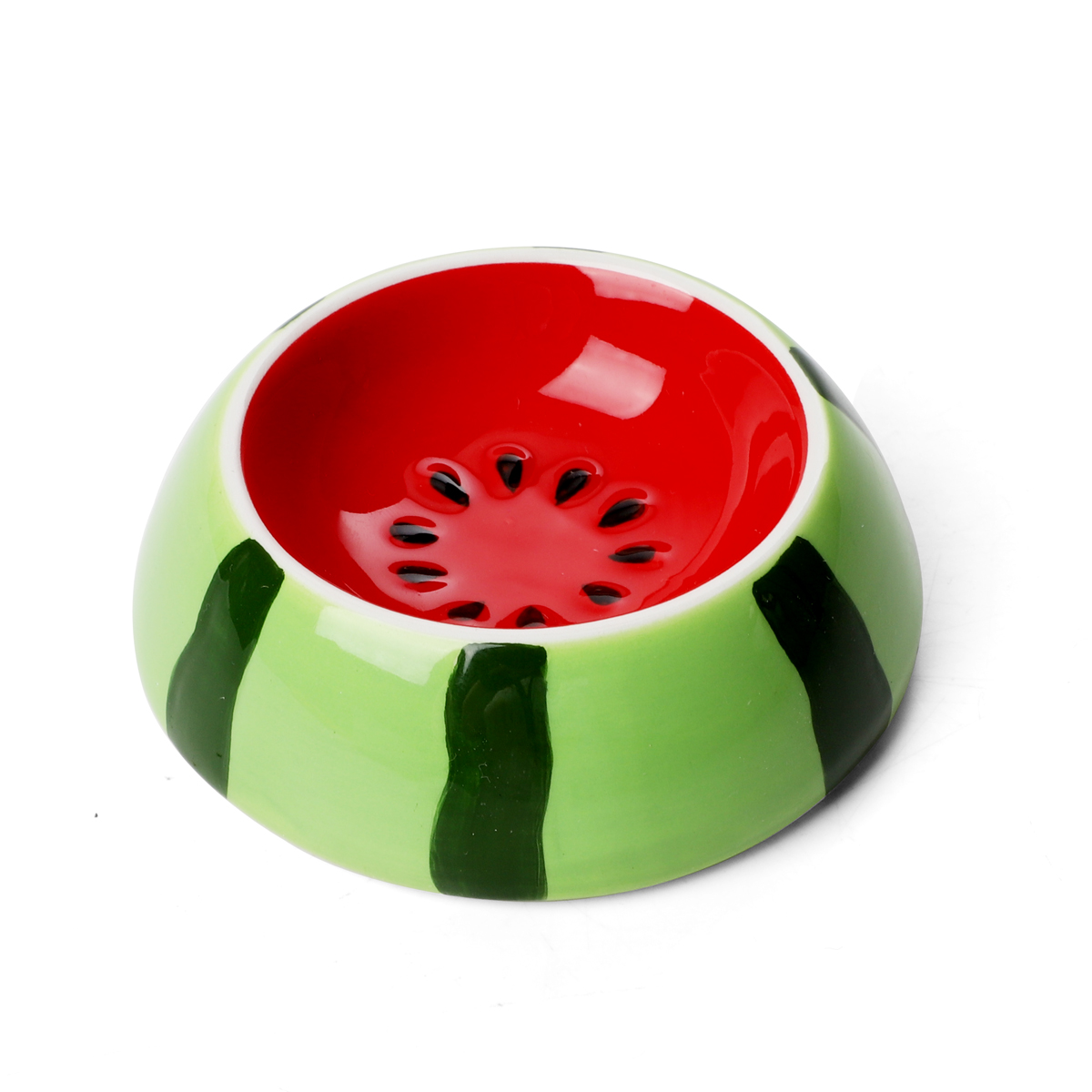 Стильная и функциональная миска для мелких животных выполнена из высококачественной керамики яркой расцветки. Такая миска идеально подойдет для корма или лакомств. Она комфортна для питомца и легко моется под струей проточной воды с использованием бытовых моющих средств. А оригинальный дизайн в виде половинки арбуза позволит ей стать украшением любого интерьера. Цвет изделия: красно-зелёный. Размер изделия: d дна - 75мм; d верхней части - 55мм; высота - 25мм. Объём изделия: 0,02л.