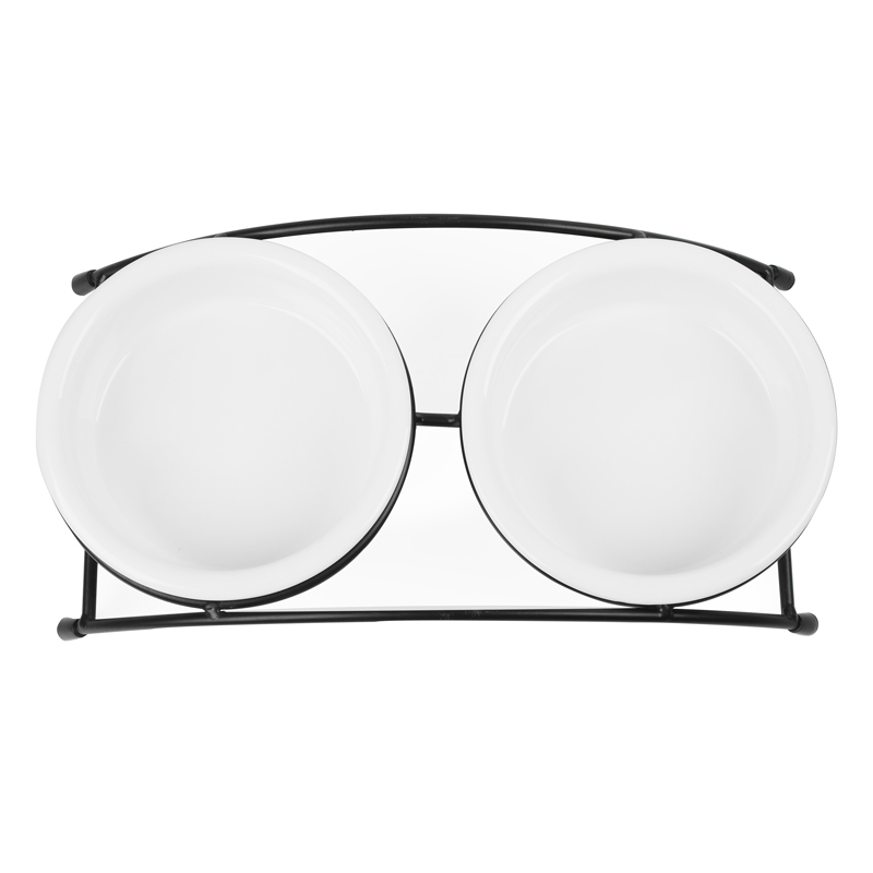Этот функциональный комплект из двух универсальных круглых мисок на подставке выполнен из керамики высокого качества и отлично подходит для кошек и собак мелких пород. Такие миски идеальны как для воды, так и для корма разной консистенции. Изделие комфортно для питомца и легко моется под струей проточной воды с использованием моющих бытовых средств. А эффектный дизайн стилизованной под ковку подставки позволит ей стать украшением любого интерьера. Цвет изделия: черно-белый. Размер изделия: d дна - 112мм; d в верхней части - 125мм; высота - 45мм. Размер подставки - 280*135*65мм. Объем - 2*0,25л.