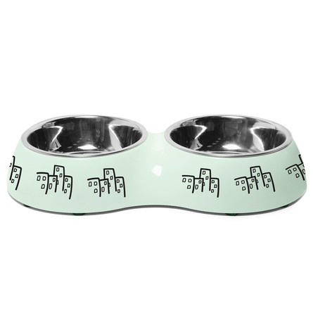 Двойная миска на пластиковой подставке "Город" для кошек и собак небольших пород. Она идеально подходит как для воды, так и для корма разной консистенции. Подставка выполнена из ударопрочного полимера, устойчивого к образованию царапин и трещин. Удобная съемная конструкция позволяет легко мыть миски из нержавеющей стали после еды под струей проточной воды с использованием моющих бытовых средств. Прорезиненное основание обеспечивает максимальную устойчивость, препятствуя скольжению изделия во время использования, а оригинальный принт сделает такую миску украшением любого интерьера. Цвет изделия: светло-мятный с серебристым. Объем: 0,22л. Размеры: 270*d145*h45мм; диаметр метал. миски - 110мм.
