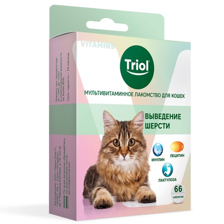 Мультивитаминное лакомство для кошек «Выведение шерсти» TRIOL - это источник полезных веществ, необходимых для поддержания естественной красоты и крепкого здоровья вашей кошки на долгие годы. Лецитин в составе благоприятно воздействует на пищеварительный тракт и действует в качестве природного эмульгатора, тем самым помогая естественному выводу шерсти из организма. Инулин способствует улучшению работы кишечника и облегчает его очищение. Во время ферментации лактулозы в организме кошки образуются органические кислоты, побуждающие слизистую оболочку кишечника к дополнительной выработке жидкости, стимулируют более активную перистальтику. Все это помогает результативно удалить комочки шерсти из организма питомца естественным путем.