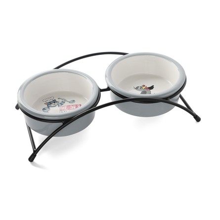 Этот функциональный комплект из двух универсальных круглых мисок на подставке выполнен из керамики высокого качества и отлично подходит для кошек и собак мелких пород. Такие миски идеальны как для воды, так и для корма разной консистенции. Изделие комфортно для питомца и легко моется под струей проточной воды с использованием бытовых моющих средств. А эффектный дизайн с персонажами известного советского мультфильма позволит ей стать украшением любого интерьера. Цвет изделия: серый с белым. Размер изделия: d дна - 112мм; d в верхней части - 125мм; высота - 45мм. Размер подставки - 280*135*65мм. Объем - 2*0,25л.