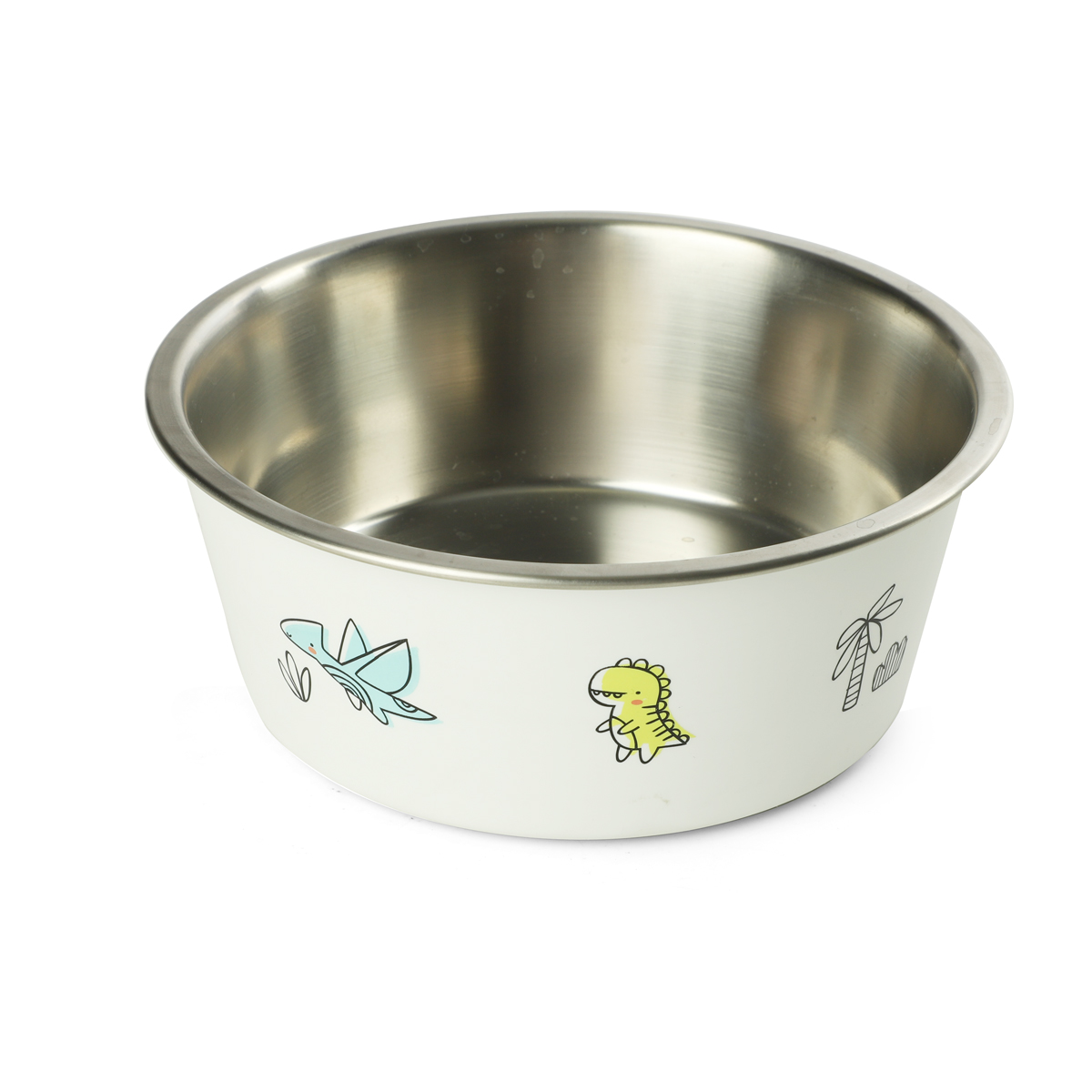 Стильная круглая миска из нержавеющей стали "Динозаврики" с высокими бортиками идеально подходит как для воды, так и для корма разной консистенции. Миска комфортна для питомцев и легко моется под струей проточной воды с использованием бытовых моющих средств. Прорезиненное основание в виде лапки обеспечивает максимальную устойчивость, препятствуя скольжению изделия во время использования, а оригинальный принт сделает такую миску украшением любого интерьера. Цвет изделия: белый с цветным принтом. Объем изделия: 0,35л. Размер изделия: d125*53мм (d дна - 95мм).
