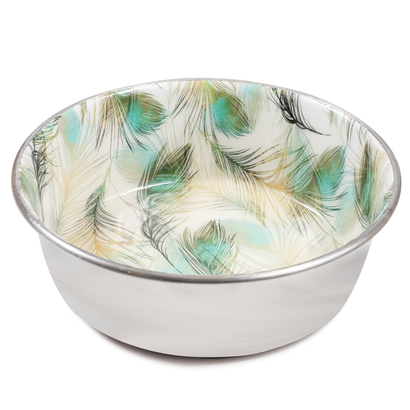 Миска интерьерная из нержавеющей стали на резинке "Перышки" для кошек и собак небольших пород. Миска уникальна тем, что роспись на внутренней поверхности изделия выполнена вручную. Изделие идеально подходит как для воды, так и для корма разной консистенции. Прорезиненное основание обеспечивает максимальную устойчивость, препятствуя скольжению изделия во время использования, а необычная роспись сделает такую миску украшением любого интерьера. Миска комфортна для питомца и легко моется под струей проточной воды с использованием моющих бытовых средств. Не рекомендуется мыть в посудомоечной машине. Цвет изделия: бело-охристо-зеленый. Объем: 1л. Размеры: d168*57мм.