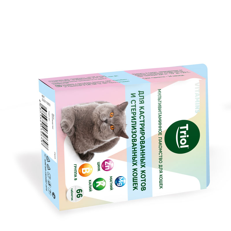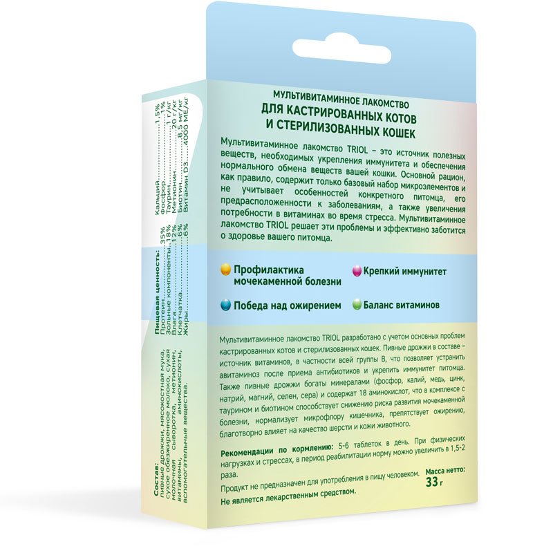 Мультивитаминное лакомство TRIOL – это источник полезных веществ, необходимых для укрепления иммунитета и обеспечения нормального обмена веществ вашей кошки. Основной рацион, как правило, содержит только базовый набор микроэлементов и не учитывает особенностей конкретного питомца, его предрасположенности к заболеваниям, а также увеличения потребности в витаминах во время стресса. Мультивитаминное лакомство TRIOL решает эти проблемы и эффективно заботится о здоровье вашего питомца. Мультивитаминное лакомство TRIOL разработано с учетом основных проблем кастрированных котов и стерилизованных кошек. Пивные дрожжи в составе – источник витаминов, в частности всей группы В, что позволяет устранить авитаминоз после приема антибиотиков и укрепить иммунитет питомца. Также пивные дрожжи богаты минералами (фосфор, калий, медь, цинк, натрий, магний, селен, сера) и содержат 18 аминокислот, что в комплексе с таурином и биотином способствует снижению риска развития мочекаменной болезни, нормализует микрофлору кишечника, преп