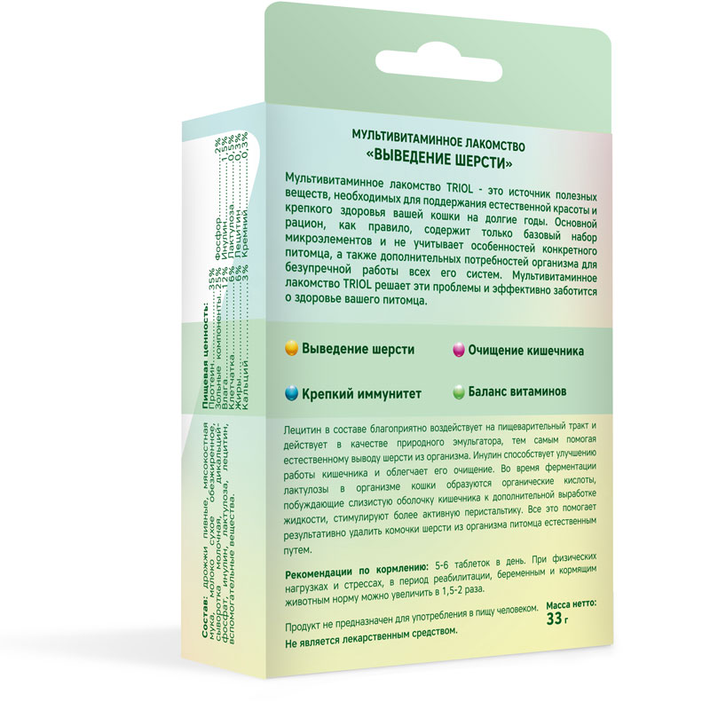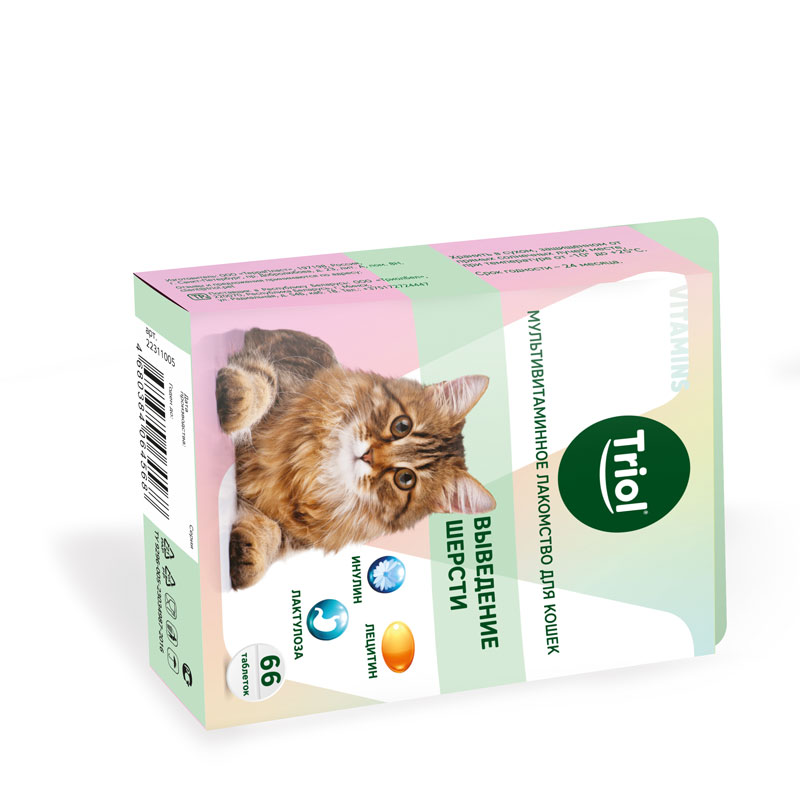 Мультивитаминное лакомство для кошек «Выведение шерсти» TRIOL - это источник полезных веществ, необходимых для поддержания естественной красоты и крепкого здоровья вашей кошки на долгие годы. Лецитин в составе благоприятно воздействует на пищеварительный тракт и действует в качестве природного эмульгатора, тем самым помогая естественному выводу шерсти из организма. Инулин способствует улучшению работы кишечника и облегчает его очищение. Во время ферментации лактулозы в организме кошки образуются органические кислоты, побуждающие слизистую оболочку кишечника к дополнительной выработке жидкости, стимулируют более активную перистальтику. Все это помогает результативно удалить комочки шерсти из организма питомца естественным путем.