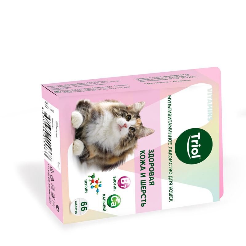Мультивитаминное лакомство TRIOL – это источник полезных веществ, необходимых для укрепления иммунитета и обеспечения нормального обмена веществ вашей кошки. Основной рацион, как правило, содержит только базовый набор микроэлементов и не учитывает особенностей конкретного питомца, его предрасположенности к заболеваниям, а также увеличения потребности в витаминах во время стресса. Мультивитаминное лакомство TRIOL решает эти проблемы и эффективно заботится о здоровье вашего питомца. Биотин в составе лакомства положительно влияет на качество и структуру шерсти, а также препятствует появлению перхоти и сухости кожи. Таурин – важная для здоровья кошек аминокислота, наличие которой в организме способствует хорошему зрению, поддерживает работу сердечно-сосудистой системы и укрепляет иммунитет. Дефицит биотина и таурина приводит к чрезмерному выпадению шерсти, разрушению зубов и ломкости когтей, нарушению обмена веществ. Масса нетто: 33г. В упаковке: 66 таблеток. Цвет: нежно-розовый.