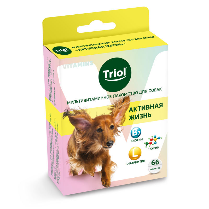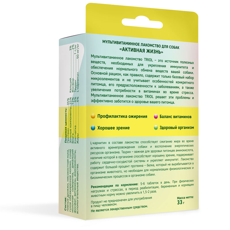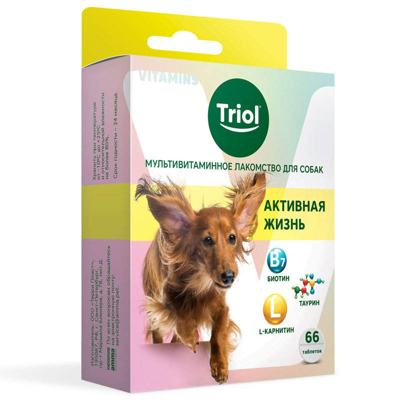 Мультивитаминное лакомство TRIOL – это источник полезных веществ, необходимых для укрепления иммунитета и обеспечения нормального обмена веществ вашей собаки. Основной рацион, как правило, содержит только базовый набор микроэлементов и не учитывает особенностей конкретного питомца, его предрасположенности к заболеваниям, а также увеличения потребности в витаминах во время стресса. Мультивитаминное лакомство TRIOL решает эти проблемы и эффективно заботится о здоровье вашего питомца. L-карнитин в составе лакомства способствует сжиганию жира во время активного времяпровождения собаки и восполнению энергетических ресурсов организма. Таурин – важная для здоровья питомцев аминокислота, наличие которой в организме способствует хорошему зрению, поддерживает работу сердечно-сосудистой системы и укрепляет иммунитет. Лакомство содержит большой процент протеина – белка, который не вырабатывается в организме животного, но необходим для нормализации физиологических и биохимических процессов в организме собаки. Масса нетто: