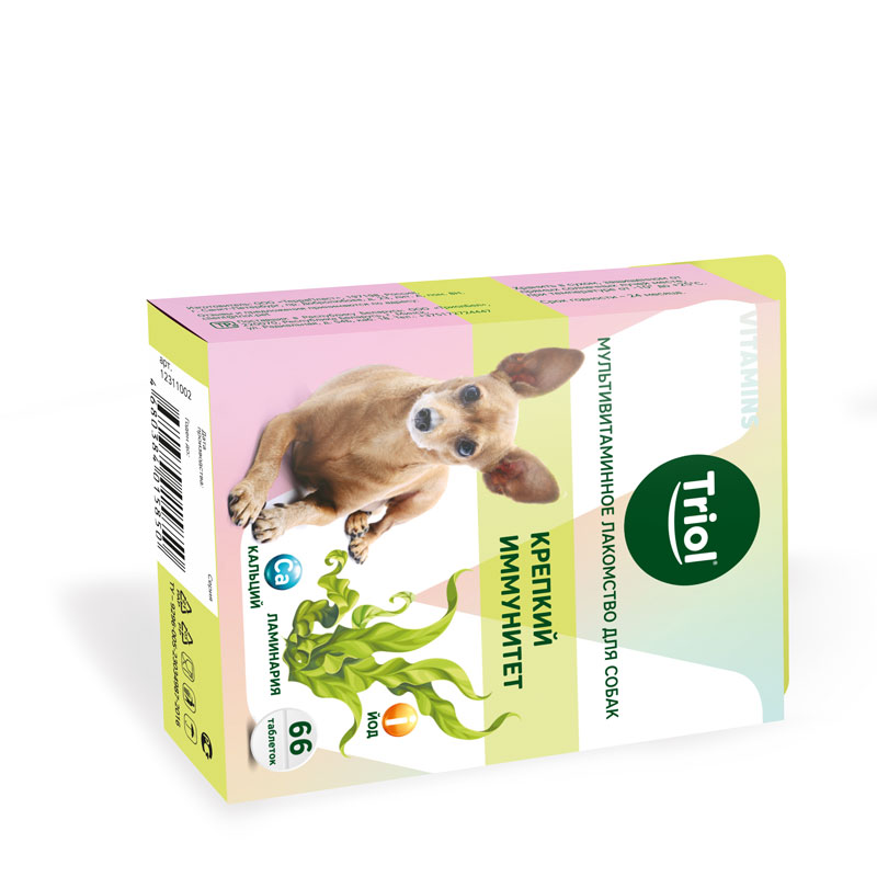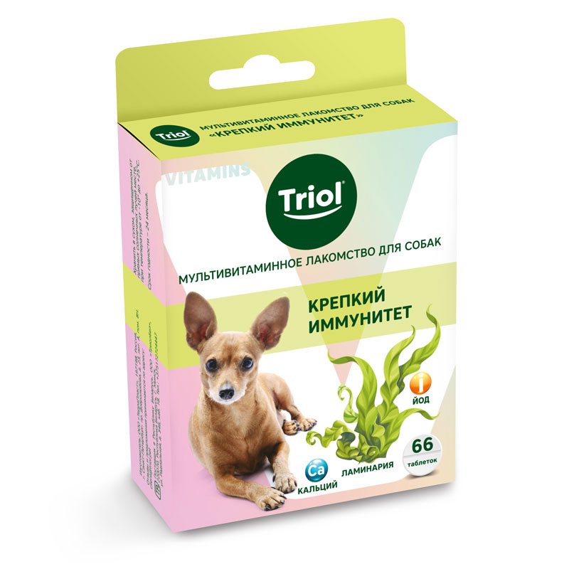 Мультивитаминное лакомство TRIOL – это источник полезных веществ, необходимых для укрепления иммунитета и обеспечения нормального обмена веществ вашей собаки. Основной рацион, как правило, содержит только базовый набор микроэлементов и не учитывает особенностей конкретного питомца, его предрасположенности к заболеваниям, а также увеличения потребности в витаминах во время стресса. Мультивитаминное лакомство TRIOL решает эти проблемы и эффективно заботится о здоровье вашего питомца. Ламинария в составе лакомства благоприятно влияет на работу ЖКТ, способствует снижению кислотности желудка и выведению из организма вредных веществ. Морская капуста (другое название ламинарии) – богатый источник йода, который способствует нормализации обмена веществ, повышает активность иммунной системы и положительно влияет на состояние кожного и шерстного покрова животного. Фосфор и кальций в составе лакомства способствуют укреплению костной ткани и здоровью зубов. Масса нетто: 33г. В упаковке: 66 таблеток. Цвет: светло-зеленый.