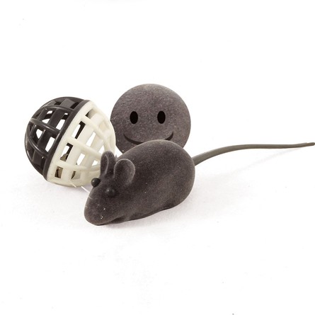 Этот набор из трех ярких и функциональных игрушек - отличный вариант для активной и разнообразной игры с пушистыми питомцами. В комплект входят: мячик пластиковый сетчатый черно-белый с колокольчиком (d45мм); мягкий серый велюровый мячик с принтом смайлика и пищалкой (d40мм); серая велюровая мышка с пищалкой (60*23*27/130мм). С такими игрушками маленькие котята хорошо развиваются, а взрослые животные - держат себя в тонусе и оттачивают охотничьи навыки. Набор упакован в прозрачный пакет с клапаном.