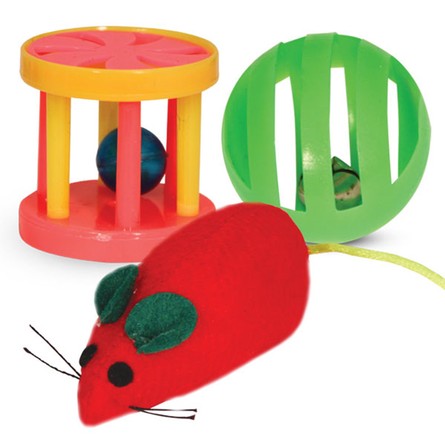 Этот набор из трех ярких игрушек - отличный вариант для активной и разнообразной игры с пушистыми питомцами. В комплект входят: мышь меховая (d25*55/105мм); мяч из пластика с погремушкой внутри (d45мм); барабанчик с колокольчиком внутри (d41*40мм). С такими игрушками маленькие котята хорошо развиваются, а взрослые животные - держат себя в тонусе и оттачивают охотничьи навыки. Набор упакован в прозрачный пакет c клапаном.