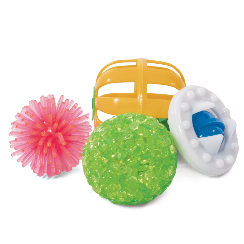 Этот набор из четырех ярких игрушек - отличный вариант для активной и разнообразной игры с пушистыми питомцами. В комплект входят: погремушка (d40мм), мяч-эллипс с колокольчиком внутри (d45мм), мяч зернистый (d40мм), мяч шуршик (d35мм). С такими игрушками маленькие котята хорошо развиваются, а взрослые животные - держат себя в тонусе и оттачивают охотничьи навыки. Набор упакован в блистер.
