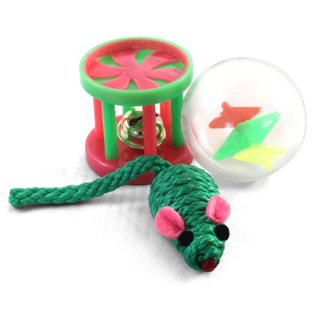 Этот набор из трех ярких игрушек - отличный вариант для активной и разнообразной игры с пушистыми питомцами. В комплект входят: мышь меховая (d25*55/105мм); мяч из пластика с погремушкой внутри (d45мм); барабанчик с колокольчиком внутри (d41*40мм). С такими игрушками маленькие котята хорошо развиваются, а взрослые животные - держат себя в тонусе и оттачивают охотничьи навыки. Набор упакован в прозрачный пакет c клапаном.