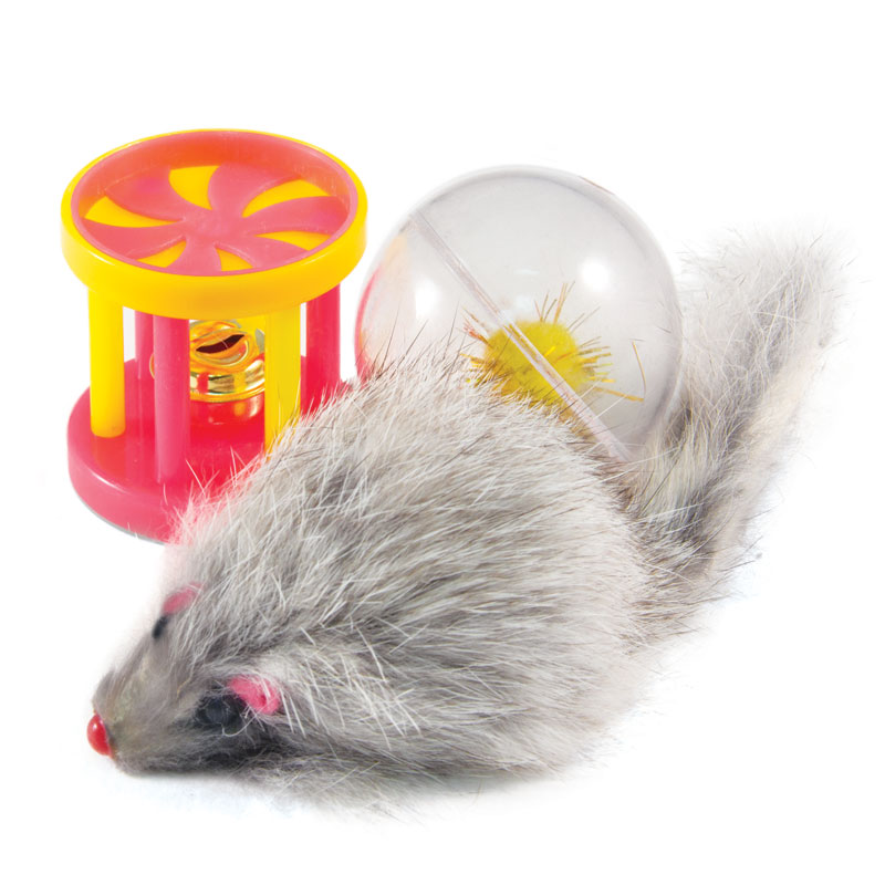 Этот набор из трех ярких игрушек - отличный вариант для активной и разнообразной игры с пушистыми питомцами. В комплект входят: мышь меховая (d25*55/105мм); мяч из пластика с погремушкой внутри (d45мм); барабанчик с колокольчиком внутри (d41*40мм). С такими игрушками маленькие котята хорошо развиваются, а взрослые животные - держат себя в тонусе и оттачивают охотничьи навыки. Набор упакован в прозрачный пакет c клапаном.