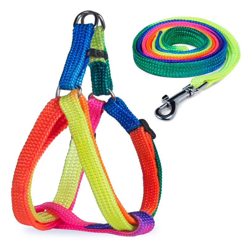 Набор из 6 ярких и функциональных комплектов для кошек и собак, включающих шлейку и поводок в единой стилистике. Каждый комплект изготовлен из высококачественного нейлона с использованием крепкой металлической фурнитуры. Длина шлейки регулируется, сбоку от застежки имеется удобное кольцо для крепления поводка. Размеры изделия: шлейка 10*310-460 мм; поводок: 10*1200мм.