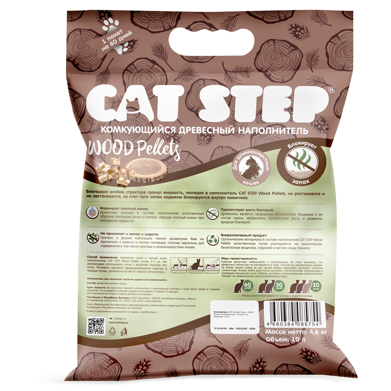 Гранулы древесного наполнителя CAT STEP Wood Pellets изготовлены из волокон необработанной хвойной древесины в виде небольших пеллет диаметром 4 мм.
