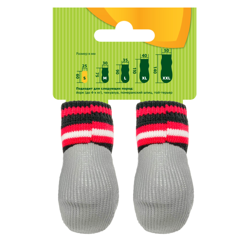 Комплект носков для собак "Полоски" состоит из четырех изделий, выполненных преимущественно из хлопка с водостойким нитриловым покрытием на подошве. Нитриловое покрытие изготавливают из искусственно синтезированного каучука, пришедшего на смену натуральному латексу. Нитрил не вызывает аллергии, более прочный и износостойкий. Используя такие носочки на улице, Вы защитите лапы собаки от снега, слякоти, реагентов и порезов. В домашних условиях такие носочки ограждают интерьер от когтей любимца и, благодаря противоскользящему покрытию, позволяют четвероногому питомцу с комфортом передвигаться по паркету, кафелю и другим скользким покрытиям. Носочки легко одевать, а благодаря эластичным резинкам они не слезают с лап животного. Изделия просты в уходе и избавят вас от регулярного мытья лап собаке после прогулки. Цвет: серо-черный с красным. Размеры изделия: 25*60мм.